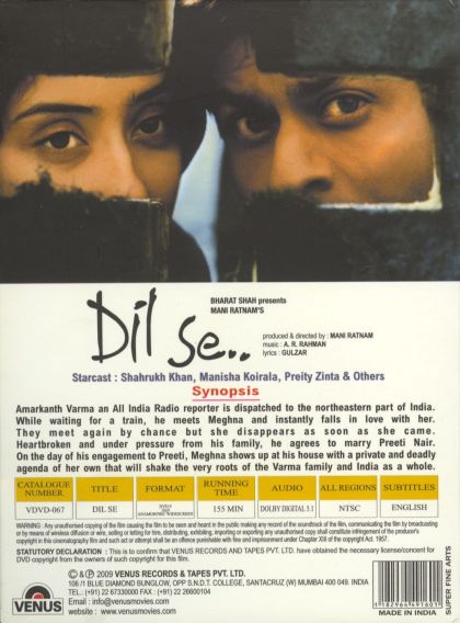 Dil Se is a 1998 Hindi film directed by Mani Ratnam. The film stars Shahrukh Khan, Manisha Koirala, and Preity Zinta. Mani Ratnam also wrote the screenplay for the film. It was produced by Mani Ratnam and Ram Gopal Varma in conjunction with Shekar Kapur.