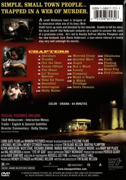 A small Oklahoma town is stripped of its innocence when one of its boys (Nick Stahl) turns up mute and bloodied by the lakeside. Unable to tell his story, the local sheriff (Hal Holbrook) embarks on a quest to uncover the roots of a gruesome crime. He's led to Ainsley DuPree (Martha Plimpton) and her new husband, Jack (Kevin Anderson), a man whose interest in family may very well outweigh his morals.