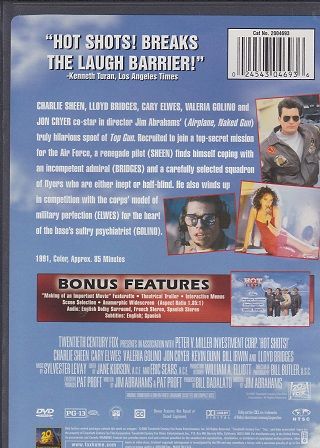 Charlie Sheen, Lloyd Bridges, Cary Elwes, Valeria Golino and Jon Cryer co-star in director Jim Abrahams' (Airplane, Naked Gun) truly hilarious spoof of Top Gun. Recruited to join a top-secret mission for the Air Force, a renegade pilot (Sheen) finds himself coping with an incompetent admiral (Bridges) and a carefully selected squadron of flyers who are either inept or half-blind.