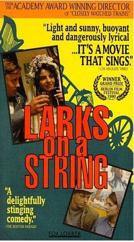 SKŘIVÁNKY NA NITI natočil v roce 1969 Jiří Menzel na motivy povídek z knihy Bohumila Hrabala Inzerát na dům, ve kterém už nechci bydlet (1965). Dvacet let zůstal film uzavřen v trezoru, protože odkrýval skutečnosti padesátých let, jež měly zůstat skryty. Jeho děj se odehrává v kladenských ocelárnách, kam byli posíláni na brigádu "političtí provinilci" (živnostníci, intelektuálové i lidi pevní v náboženské víře). Vedle nich pracují na šrotišti i ženy a dívky, uvězněné za pokus o útěk za hranice, tzv. "kopečkářky". Celý film je jediným pásmem paradoxních, někdy groteskních, jindy lyrických situací.