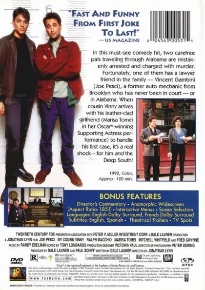 Two carefree pals traveling through rural Alabama on their way back to college are mistakenly arrested and charged with murder. Fortunately, one of them has a cousin who's a lawyer - Vincent Gambini, a former auto mechanic from Brooklyn who has just passed his bar exam after his sixth try. When he arrives with his leather-clad girlfriend to try his first case, it's a real shock - for him and the Deep South!
