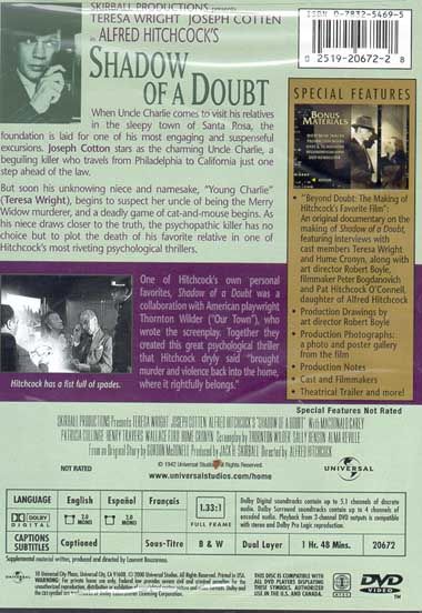 A bored young woman, a teen living in Santa Rosa, California, Charlotte "Charlie" Newton (Wright), is frustrated because nothing seems to be happening in her life and that of her family. Then, she receives wonderful news: her uncle (for whom she was named), Charlie Oakley (Cotten), her mother's brother, is arriving for a visit. But Uncle Charlie may not be the man he seems to be.