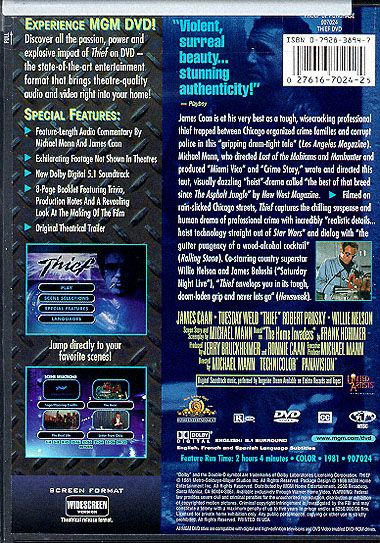Michael Mann directs James Caan as a professional safecracker named Frank, who specializes in high-profile diamond heists. Frank plans to use his ill-gotten income to retire from crime and build a nice life for himself complete with a home, wife and kids. To accelerate this process, he signs on with a top gangster (Robert Prosky) for a big score. But when Frank tries to quit the job, the mob comes after him and his girlfriend (Tuesday Weld).
