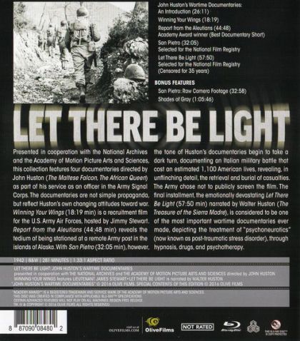 Presented in cooperation with the National Archives and the Academy of Motion Picture Arts and Sciences, this collection features four documentaries directed by John Huston (The Maltese Falcon, The African Queen) as part of his service as an officer in the Army Signal Corps. The documentaries are not simple propaganda, but reflect Huston's own changing attitudes toward war. Winning Your Wings (18:19 min) is a recruitment film for the U.S. Army Air Forces, hosted by Jimmy Stewart. Report from the Aleutians (44:48 min) reveals the tedium of being stationed at a remote Army post in the islands of Alaska. With San Pietro (32:05 min), however, the tone of Huston's documentaries begin to take a dark turn, documenting an Italian military battle that cost an estimated 1,100 American lives, revealing, in unflinching detail, the retrieval and burial of casualties. The Army chose not to publicly screen the film. The final installment, the emotionally devastating Let There Be Light (57:50 min) narrated by Walter Huston (The Treasure of the Sierra Madre), is considered to be one of the most important wartime documentaries ever made, depicting the treatment of "psychoneurotics" (now known as post-traumatic stress disorder), through hypnosis, drugs, and psychotherapy.