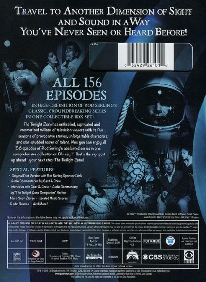 All 156 episodes of Rod Serling's classic, groundbreaking series are presented in pristine high-definition in this spectacular Blu-ray box set. Also includes many hours of special bonus features, including: Rare unofficial pilot episode "The Time Element," Original unaired pilot version of "Where is Everybody?" with Rod Serling's network pitch, Numerous audio commentaries and interviews, Rod Serling's audio lectures, Promos for "next week's" show, Radio dramas, Sponsor billboards, Isolated music scores, and so much more. See individual titles for more info.