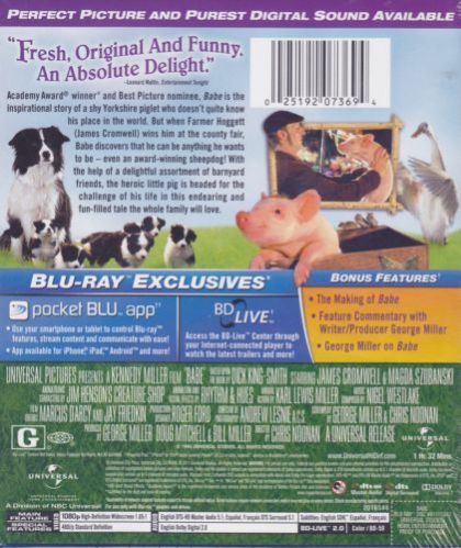 Babe is a little pig who doesn't quite know his place in the world. With a bunch of odd friends, like Ferdinand the duck who thinks he is a rooster and Fly the dog he calls mum, Babe realises that he has the makings to become the greatest sheep pig of all time, and Farmer Hoggett knows it. With the help of the sheep dogs, Babe learns that a pig can be anything that he wants to be.