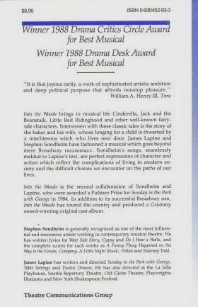 "Into the Woods brings to musical life Cinderella, Jack and the Beanstalk, Little Red Ridinghood and other well-known fairytale characters. Interwoven with these classic tales is the story of the baker and his wife, whose longing for a child is thwarted by a mischeivous witch who lives next door. James Lapine and Stephen Sondheim have fashioned a musical which goes beyond mere Broadway razzmatazz. Sondheim's songs, seamlessly melded to Lapine's text, are perfect expressions of character and action which reflect the complications of living in modern society and the difficult choices we encounter on the paths of our lives." --