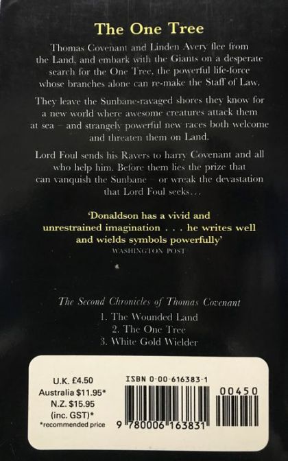 2. THE ONE TREE Thomas Covenant and Linden Avery flee from the Land, and embark with the Giants on a desperate search for The One Tree, the powerful life-force whose branches alone can re-make the staff of Law. They leave the Sunbane-ravaged shores they know for a new world where awesome creatures attack them at sea - and strangely powerful new races both welcome and threaten them on Land. Lord Foul sends his Ravers to harry Cocenant and all who help him. Before them lies the prize that can vanquish the Sunbane - or wreak the devastation that Lord Foul seeks