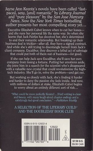 With her hallmark blend of sparkling style and wit, intricate suspense, and steamy passion, Jayne Ann Krentz is truly one of a kind. One of today's premier storytellers, she has more than twenty-three million copies of her novels in print. Now the phenomenal New York Times bestselling author spins her latest scintillating tale: a story of two people bound together by that most binding of ties--a business contract. Elizabeth Cabot is all business. She knows how to maximize her investments and cut her losses--in both her career and her personal life. So when she discovers that Jack Fairfax has deceived her, she's determined to end their relationship. Putting a stop to their budding romance is easy. But breaking up their business deal will be more difficult. Despite all her efforts, she has no luck disentangling herself from Jack's client company, Excalibur. But the situation becomes even more strained when a new obstacle emerges: a lethal act of sabotage that could put both of them out of business for good. Elizabeth is no fool. If she can help Jack save Excalibur, she'll recoup her substantial investment plus millions in profit. Putting her emotions aside, she insists on helping him search for the scientist who's disappeared with a valuable new crystal that could revolutionize the high-tech industry. She'll go in, solve the problem--and get out. The trail leads Elizabeth and Jack to a fringe film festival, but their goal is as elusive as the shadowy black-and-white images from classic noir films. Life starts to imitate art, and double-dealing seems to be the name of the game. For these business adversaries turned reluctant partners, keeping an eye on each other--and the lid on a sizzling attraction--seems the only insurance against further treachery. But with millions at stake, trust can turn to betrayal in the blink of an eye.