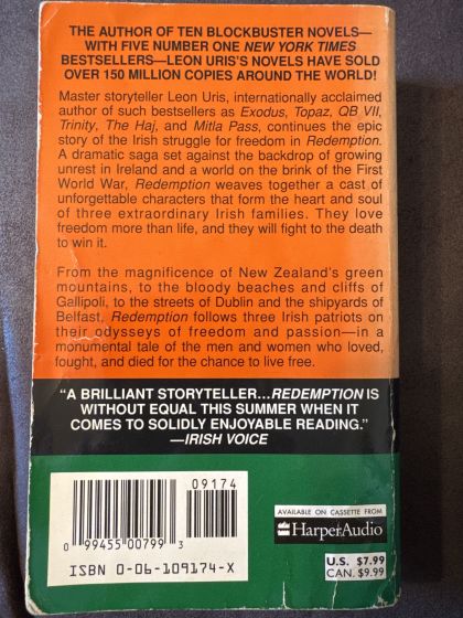Master storyteller Leon Uris, internationally acclaimedauthor of such bestsellers as Exodus, Topaz, QB VII,Trinity, the Haj and Mitla Pass,continues the epic story of the Irish struggle for freedom inRedemption. A dramatic saga set against the backdrop of growing unrest in Ireland and a world on the brink of the First World War,Redemption weaves together a cast of unforgettable characters that form the heart and soul of three extraordinary Irish families.hey love freedom more than life,and they will fight to the death to win it.From the magnificence of New Zealand's green mountains, to the bloody beaches and cliffs of Gallipoli, to the streets of Dublin and the shipyards of Belfast,Redemptionfollows three Irish Patriots on their odysseys of freedom and passion- in a monumental tale of the men and women who loved, fought, and died for the chance to be free.