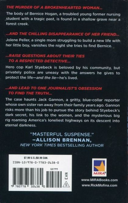 The murder of a brokenhearted woman…The body of Bernice Hogan, a troubled young former nursing student with a tragic past, is found in a shallow grave near a forest creek.…and the chilling disappearance of her friend…Jolene Peller, a single mom struggling to build a new life with her little boy, vanishes the night she tries to find Bernice.…raise questions about their ties to a respected detective…Hero cop Karl Styebeck is beloved by his community, but privately police are uneasy with the answers he gives to protect the life—and the lie—he's lived.…and lead to one journalist's obsession to find the truth…The case haunts Jack Gannon, a gritty, blue-collar reporter whose own sister ran away from their family years ago. Gannon risks more than his job to pursue the story behind Styebeck's dark secret, his link to the women, and the mysterious big rig roaming America's loneliest highways on its descent into eternal darkness.