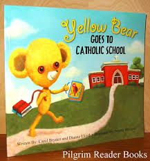 Picture book about a young girl's first day in Kindergarten in a Catholic school (the bear is in her packback).