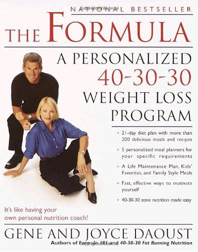 Are you frustrated by low-fat/high-carbohydrate or all-protein diets that don't work? Tired of white-knuckle restrictions or doing math at every meal? Fed up with a constant craving for sugars and carbohydrates? Do you wish you had a magic formula for losing weight and keeping it off? Well, now you do. . . . Pioneering weight loss and certified sports nutritionists Gene and Joyce Daoust have personally helped thousands of people lose weight, tone up, and enjoy a healthier, more fit lifestyle. Their advice? Drop the rice cakes and calorie-counting, and stop trying to figure out those complicated "food blocks." The Formula teaches an easy way to balanced nutrition that will have you burning fat 24-hours a day while eating foods you enjoy! Featuring menu plans, shopping lists, and progress charts, The Formula provides a personalized program for each person's specific needs and body type. So whether you're a couch potato, a professional athlete, or somewhere in between, you'll discover:* Five different versions of the Formula--and how to find the right one for your weight and activity level* The 21-Day Fat Flush Formula for accelerated weight loss* More than 200 delicious recipes, including perfectly balanced 40-30-30 fajitas, chili, pork tenderloin, and New York cheesecake* Special Kids' Favorites and Family Style meals* Healthy advice on prepared foods, fast foods, and vegetarian meals A plan for life, The Formula is a dieter's dream--the lifetime secret to losing weight, staying slim, and feeling great!