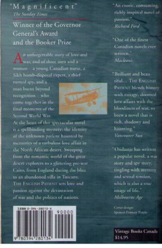 With ravishing beauty and unsettling intelligence, Michael Ondaatje's Booker Prize-winning novel traces the intersection of four damaged lives in an Italian villa at the end of World War II. Hana, the exhausted nurse; the maimed thief, Caravaggio; the wary sapper, Kip: each is haunted by the riddle of the English patient, the nameless, burned man who lies in an upstairs room and whose memories of passion, betrayal,and rescue illuminates this book like flashes of heat lightning.
