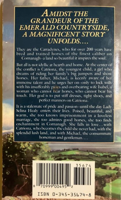 Amidst the grandeur of the emerald countryside, a magnificent story unfolds. . . .They are the Carradynes, who for more than 200 years have bred and trained horses of the finest caliber on Cornanagh—a land so beautiful it inspires the soul.But all is not idyllic at hearth and home. At the center of the conflict is Catriona, the youngest child, a girl who dreams of riding her family’s big jumpers and show horses. Her father, Michael, is keenly aware of her immense talent, and he urges her on—only to lock wills with his insufferably pious and overbearing wife, Isabel, a woman who cannot bear horses, who cannot bear his touch. Her goal is to put stiff dresses, tight shoes, and perfect manners on Catriona.It is a stalemate of pride and passion—until the day Lady Selina Healy enters their lives. Poised, beautiful, and warm, she too knows imprisonment in a loveless marriage, she too admires good horses, she too finds enchantment in Cornanagh. She falls in love . . . with Catriona, who becomes the child she never had; with the splendid lush land; and with Michael, the consummate horseman and gentleman.