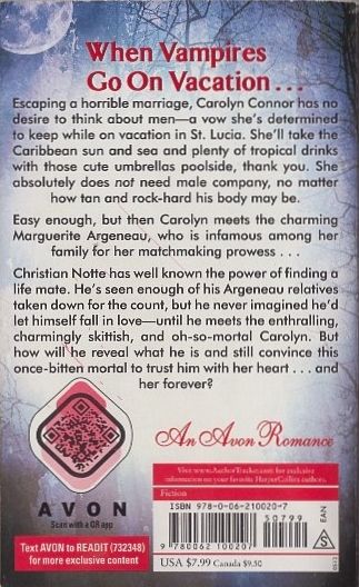 When Vampires Go On Vacation . . . Escaping a horrible marriage, Carolyn Connor has no desire to think about men—a vow she's determined to keep while on vacation in St. Lucia. She'll take the Caribbean sun and sea and plenty of tropical drinks with those cute umbrellas poolside, thank you. She absolutely does not need male company, no matter how tan and rock-hard his body may be. Easy enough, but then Carolyn meets the charming Marguerite Argeneau, who is infamous among her family for her matchmaking prowess . . . Christian Notte has well known the power of finding a life mate. He's seen enough of his Argeneau relatives taken down for the count, but he never imagined he'd let himself fall in love—until he meets the enthralling, charmingly skittish, and oh-so-mortal Carolyn. But how will he reveal what he is and still convince this once-bitten mortal to trust him with her heart . . . and her forever?