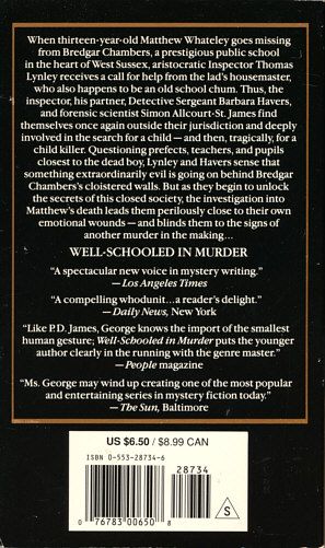 When thirteen-year-old Matthew Whately goes missing from Bredgar Chambers, a prestigious public school in the heart of West Sussex, aristocratic Inspector Thomas Lynley receives a call for help from the lad's housemaster, who also happens to be an old school chum. Thus, the inspector, his partner, Detective Sergeant Barbara Havers, and forensic scientist Simon Allcourt-St. James find themselves once again outside their jurisdiction and deeply involved in the search for a child-- and then, tragically, for a child killer. Questioning prefects, teachers, and pupils closest to the dead boy, Lynley and Havers sense that something extraordinarily evil is going on behind Bredgar Chambers's cloistered walls. But as they begin to unlock the secrets of this closed society, the investigation into Matthew's death leads them perilously close to their own emotional wounds-- and blinds them to the signs of another murder in the making....