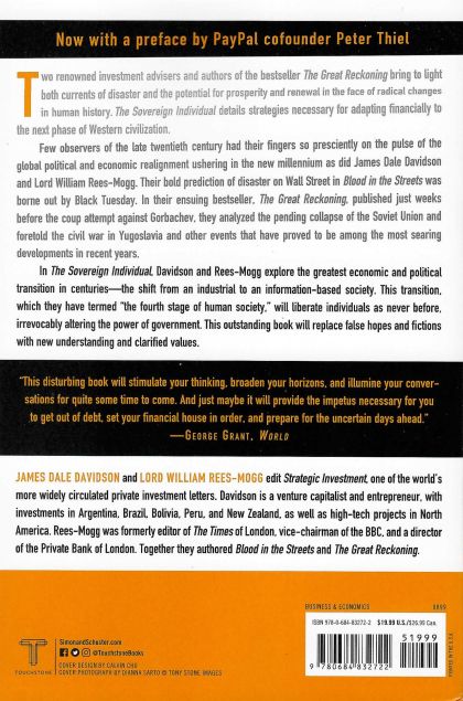 Now featuring a new preface by Peter Thiel Two renowned investment advisors and authors of the bestseller The Great Reckoning bring to light both currents of disaster and the potential for prosperity and renewal in the face of radical changes in human history as we move into the next century. The Sovereign Individual details strategies necessary for adapting financially to the next phase of Western civilization. Few observers of the late twentieth century have their fingers so presciently on the pulse of the global political and economic realignment ushering in the new millennium as do James Dale Davidson and Lord William Rees-Mogg. Their bold prediction of disaster on Wall Street in Blood in the Streets was borne out by Black Tuesday. In their ensuing bestseller, The Great Reckoning, published just weeks before the coup attempt against Gorbachev, they analyzed the pending collapse of the Soviet Union and foretold the civil war in Yugoslavia and other events that have proved to be among the most searing developments of the past few years. In The Sovereign Individual, Davidson and Rees-Mogg explore the greatest economic and political transition in centuries—the shift from an industrial to an information-based society. This transition, which they have termed "the fourth stage of human society," will liberate individuals as never before, irrevocably altering the power of government. This outstanding book will replace false hopes and fictions with new understanding and clarified values.