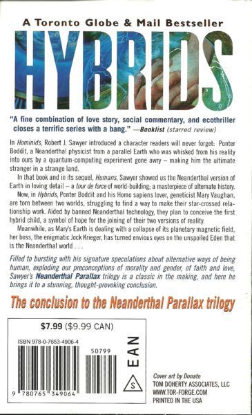 In the Hugo-Award winning Hominids, Robert J. Sawyer introduced a character readers will never forget: Ponter Boddit, a Neanderthal physicist from a parallel Earth who was whisked from his reality into ours by a quantum-computing experiment gone awry - making him the ultimate stranger in a strange land.In that book and in its sequel, Humans, Sawyer showed us the Neanderthal version of Earth in loving detail - a tour de force of world-building; a masterpiece of alternate history.Now, in Hybrids, Ponter Boddit and his Homo sapiens lover, geneticist Mary Vaughan, are torn between two worlds, struggling to find a way to make their star-crossed relationship work. Aided by banned Neanderthal technology, they plan to conceive the first hybrid child, a symbol of hope for the joining of their two versions of reality. But after an experiment shows that Mary's religious faith - something completely absent in Neanderthals - is a quirk of the neurological wiring of Homo sapiens brains, Ponter and Mary must decide whether their child should be predisposed to atheism or belief. Meanwhile, as Mary's Earth is dealing with a collapse of its planetary magnetic field, her boss, the enigmatic Jock Krieger, has turned envious eyes on the unspoiled Eden that is the Neanderthal world . . . Hybrids is filled to bursting with Sawyer's signature speculations about alternative ways of being human, exploding our preconceptions of morality and gender, of faith and love. His Neanderthal Parallax trilogy is a classic in the making, and here he brings it to a stunning, thought-provoking conclusion that's sure to make Hybrids one of the most controversial books of the year.