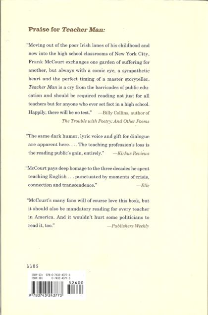 Nearly a decade ago Frank McCourt became an unlikely star when, at the age of sixty-six, he burst onto the literary scene with Angela's Ashes, the Pulitzer Prize -- winning memoir of his childhood in Limerick, Ireland. Then came 'Tis, his glorious account of his early years in New York.Now, here at last, is McCourt's long-awaited book about how his thirty-year teaching career shaped his second act as a writer. Teacher Man is also an urgent tribute to teachers everywhere. In bold and spirited prose featuring his irreverent wit and heartbreaking honesty, McCourt records the trials, triumphs and surprises he faces in public high schools around New York City. His methods anything but conventional, McCourt creates a lasting impact on his students through imaginative assignments (he instructs one class to write "An Excuse Note from Adam or Eve to God"), singalongs (featuring recipe ingredients as lyrics), and field trips (imagine taking twenty-nine rowdy girls to a movie in Times Square!). McCourt struggles to find his way in the classroom and spends his evenings drinking with writers and dreaming of one day putting his own story to paper. Teacher Man shows McCourt developing his unparalleled ability to tell a great story as, five days a week, five periods per day, he works to gain the attention and respect of unruly, hormonally charged or indifferent adolescents. McCourt's rocky marriage, his failed attempt to get a Ph.D. at Trinity College, Dublin, and his repeated firings due to his propensity to talk back to his superiors ironically lead him to New York's most prestigious school, Stuyvesant High School, where he finally finds a place and a voice. "Doggedness," he says, is "not as glamorous as ambition or talent or intellect or charm, but still the one thing that got me through the days and nights." For McCourt, storytelling itself is the source of salvation, and in Teacher Man the journey to redemption -- and literary fame -- is an exhilarating adventure.
