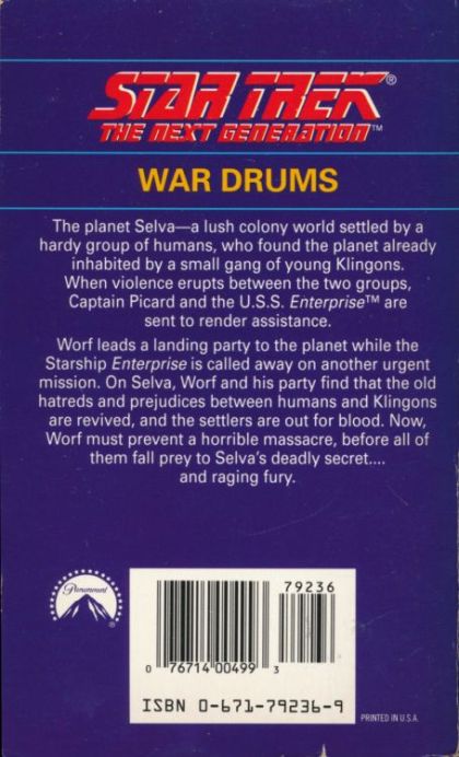 The planet Selva -- a lush colony world settled by a hardy group of humans, who found theplanet already inhabited by a small gang of young Klingons. When violence erupts between the two groupas, Captain Picard and the U.S.S. Enterprise are sent to reder assistance.Worf leads a landing party to the planet while the Starship Enterprise is called away on another urgent mission. On Selva, Worf and his party find that the old hatreds and prejudices between humans and Klingons are revived, and the settlers are out for blood. Now, Worf must prevent a horrible massacre before all of them fall prey to Selva's deadly secret...and raging fury.