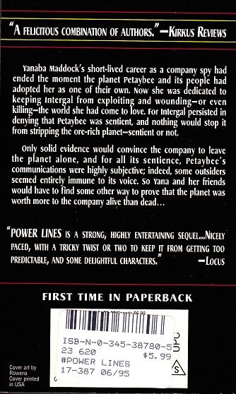 "A felicitous combination of authors." --Kirkus Reviews Yanaba Maddock's short-lived career as a company spy had ended the moment the planet Petaybee and its people had adopted her as one of their own. Now she was dedicated to keeping Intergal from exploiting and wounding--or even killing--the world she had come to love. For Intergal persisted in denying that Petaybee was sentient, and nothing would stop it from stripping the ore-rich planet--sentient or not. Only solid evidence would convince the company to leave the planet alone, and for all its sentience, Petaybee's communications were highly subjective; indeed, some outsiders seemed entirely immune to its voice. So Yana and her friends would have to find some other way to prove that the planet was worth more to the company alive than dead... "POWER LINES is a strong, highly entertaining sequel...Nicely paced, with a tricky twist or two to keep it from getting too predictable, and some delightful characters." --Locus FIRST TIME IN PAPERBACK