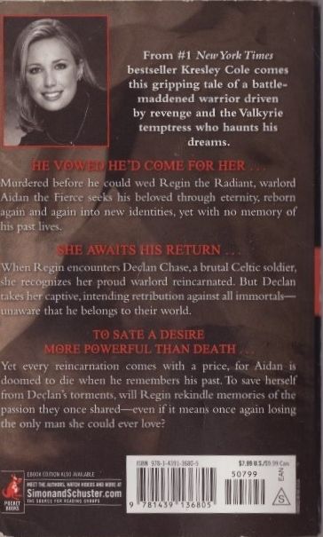 From #1 New York Times bestseller Kresley Cole comes this gripping tale of a battle-maddenend warrior driven by revenge and the Valkyrie temptress who haunts his dreams. He vowed he’d come for her. . . Murdered before he could wed Regin the Radiant, warlord Aidan the Fierce seeks his beloved through eternity, reborn again and again into new identities, yet with no memory of his past lives—only an endless yearning. She awaits his return. . . When Regin encounters Declan Chase, a brutal Celtic soldier, she recognizes her proud warlord reincarnated. But Declan takes her captive, intending retribution against all immortals, unaware that he belongs to their world. To sate a desire more powerful than death. . . Yet every reincarnation comes with a price, for Aidan is doomed to die when he remembers his past. To save herself from Declan’s torments, will Regin rekindle memories of the passion they once shared—even if it means once again losing the only man she could ever love?