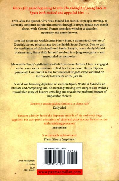From the bestselling author of the Shardlake series, C. J. Sansom, comes Winter in Madrid, a standalone historical novel set in the aftermath of the Spanish Civil War.1940: The Spanish Civil War is over, and Madrid lies ruined, its people starving, while the Germans continue their relentless march through Europe. Britain now stands alone while General Franco considers whether to abandon neutrality and enter the war.Into this uncertain world comes Harry Brett: a traumatized veteran of Dunkirk turned reluctant spy for the British Secret Service. Sent to gain the confidence of old schoo lfriend Sandy Forsyth, now a shady Madrid businessman, Harry finds himself involved in a dangerous game – and surrounded by memories.Meanwhile Sandy's girlfriend, ex-Red Cross nurse Barbara Clare, is engaged on a secret mission of her own – to find her former lover Bernie Piper, a passionate Communist in the International Brigades, who vanished on the bloody battlefields of the Jarama.In a vivid and haunting depiction of wartime Spain, Winter in Madrid by C.J. Sansom is an intimate and compelling tale which offers a remarkable sense of history unfolding, and the profound impact of impossible choices.