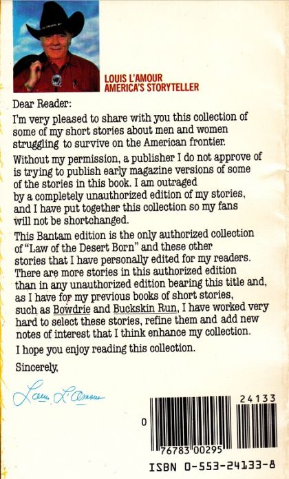 A PRIZED COLLECTION OF AMERICAN FICTION—FROM AMERICA’S FAVORITE STORYTELLER This first-rate collection of short stories by the incomparable Louis L’Amour showcases the legendary writer at his very best: spinning a fascinating and wholly authentic set of unforgettable tales. In these extraordinary stories, we meet a man who is forced to defend himself by taking another’s life—and must pay for his actions in a most punishing manner; a young thrill-seeker who finally finds a place he can call home, and vows to stay there—regardless of the man who tries to stand in his way; and a drifter who honors a deathbed promise to a stranger by embarking on an unlikely mission of mercy. Complete with revealing author’s notes, the stories in Law of the Desert Born are historically precise, and filled with L’Amour’s trademark humor and adventure. They are nothing less than modern classics of the American West, told by one of the most beloved storytellers of our time.