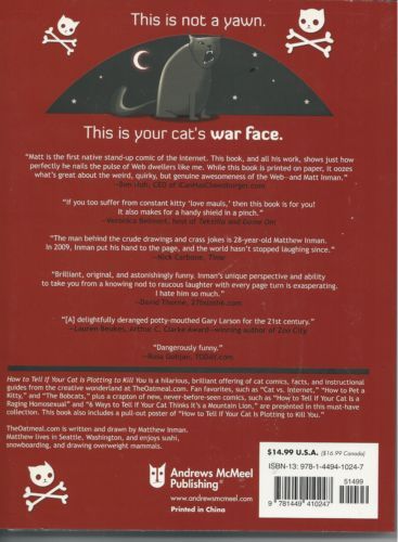 TheOatmeal.com’s most popular cat jokes, including “How to Pet a Kitty” and “The Bobcats,” plus 15 new and never-before-seen catthemed comics, are presented in this hilarious collection from New York Times best-selling author Matthew Inman, a.k.a. TheOatmeal.com. Includes pull-out poster!Jesus Rollerblading Christ--another helping of TheOatmeal! Mrow, MOAR kitty comics. Mr. Oats delivers a sidesplitting serving of cat comics in his new book, How to Tell If Your Cat Is Plotting to Kill You.If your cat is kneading you, that's not a sign of affection. Your cat is actually checking your internal organs for weakness. If your cat brings you a dead animal, this isn't a gift. It's a warning. How to Tell If Your Cat Is Plotting to Kill You is a hilarious, brilliant offering of cat comics, facts, and instructional guides from the creative wonderland at TheOatmeal.com.How to Tell If Your Cat Is Plotting to Kill You presents fan favorites, such as "Cat vs. Internet," "How to Pet a Kitty," and "The Bobcats," plus 17 brand-new, never-before-seen cat jokes. This Oatmeal collection is a must-have from Mr. Oats! A pullout poster is included at the back of the book.