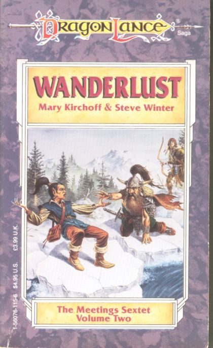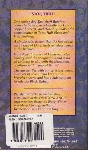 Stop, Thief! One spring day Tasslehoff Burrfoot comes to Solace, accidentally pockets a copper bracelet, and (forcibly) makes the acquaintance of Tanis Half-Elven and Flint Fireforge. A simple tale. Except that the fate of the entire race of Dargonesti sea elves hangs in the balance. How does this piece of kender-coveted jewelry lead the companions and a sea elf princess to ally with the phaethons, creatures with wings of flame? The answer lies with a mysterious mage, a broker of souls, who knows the bracelet's secret and has a hideous plan to rule the Black Robes. Wanderlust is the second exsciting installment in the Dragonlance saga Meetings Sextet by Steve Winter and Mary Kirchoff, author of" Kendermore "and "Flint, the King."
