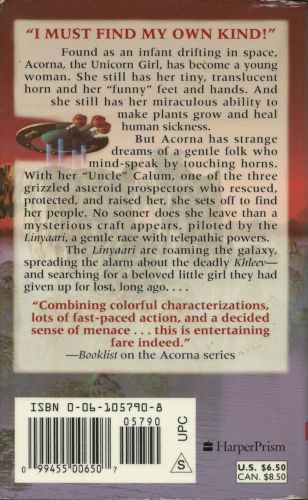 "I must find my own kind!"Found as an infant drifting in space, Acorna, the Unicorn Girl, has become a young woman. She still has her tiny, translucent horn, and her "funny" feet and hands. And, she still has her miraculous ability to make plants grow and heal human sickness. But Acorna has strange dreams of a gentle folk who mind-speak by touching horns. With her "Uncle" Calum, one of the three grizzled asteroid prospectors who rescued, protected, and raised her, she sets off to find her people. No sooner does she leave than a mysterious craft appears, piloted by the Linyaari, a gentle race with telepathic powers. The Linyaari are roaming the galaxy, spreading the alarm about the deadly Khleev--And searching for a beloved little girl they had given up for lost, long ago...