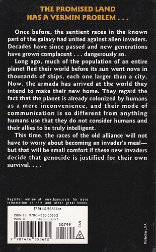 Once before, the sentient races in the known part of the galaxy -- humans, Orions, Ophiuchi and Gorm -- had united to defeat alien invaders. The "bugs" were as incomprehensibly alien as they were revoltingly evil, using all other living things, intelligent or not, as food, and they had been defeated at a terrible cost. Decades have since passed and the gallant warriors of the battle against the bugs have grown old, while new generations have grown complacent...dangerously so. Long ago, much of the population of an entire planet had built a huge fleet of ships, each ship larger than a city, and fled their world before its sun went nova. Those slower-than-light ships traversed many light years, and have now arrived at the world they intend to make their new home. They regard the fact that the planet is already colonized by humans as a mere inconvenience, the more so since their mode of communication is so different from anything humans use that they do not consider humans and their allies to be truly intelligent. And the arriving aliens know -- or, at least, they believe -- that when they die they will be reincarnated, so they do not hesitate to attack humans and their allies with suicidal fury. This time, the intelligent races of the old alliance will not have to worry about becoming an invader's meal -- but that will be small comfort if the invaders decide that genocide is justified for their own survival...