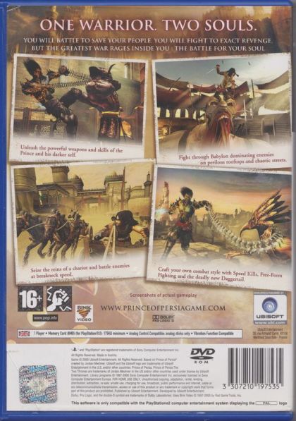 The Prince of Persia, a seasoned warrior, returns from the Island of Time to Babylon with his love, Kaileena. Instead of the peace that he longs for, he finds his homeland ravaged by war and the kingdom turned against him. The Prince is rapidly captured and Kaileena has no choice but to sacrifice herself and unleash the Sands of Time in order to save him. Now cast out on the streets and hunted as a fugitive, the Prince soon discovers that past battles have given rise to a deadly Dark Prince, whose spirit gradually possesses him. Game features include: