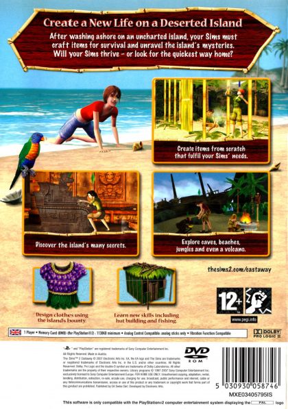 Help your Sims build a life from scratch after washing ashore on a deserted tropical island. Overcome the forces of nature to help them become the ultimate survivors and thrive in this undiscovered paradise while unearthing clues that will lead them back to civilization. Build shelters, craft unique items, and discover many useful treasures and ancient mysteries hidden deep within a diverse jungle environment filled with plants, fruits, and even wildlife. Your Sims change as they take on the challenges of island life and learn to survive in style. Create a new life for your Sims on an uncharted island in The Sims 2: Castaway.
