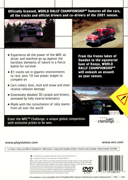 WRC: World Rally Championship is an officially licensed racing game featuring all of the cars and drivers from the official 2001 World Rally Championship. Battle your way through 81 heart-pounding stages in 14 rallies located all over the world. Experience the pure emotion, hardcore action and sheer power of rally racing in the quest for ultimate glory.