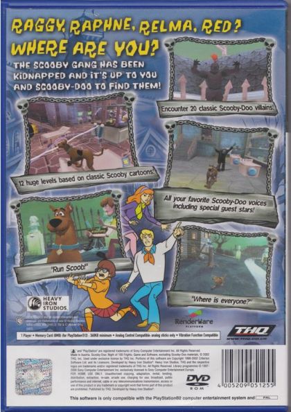Scooby-Doo! combines the classic Scooby-Doo! cartoon characters of Mystery, Inc. including Fred, Daphne, Velma and Shaggy and classic villains in captivating gameplay. Only Scooby-Doo can save his friends when a dubious Mastermind kidnaps Mystery, Inc. with alternative plans for their fate. With the use of wacky inventions, Scooby-Doo battles mysterious monsters while searching for clues in more than 12 huge levels, including a creepy mansion, a spooky cave and a ghostly graveyard. Through it all, Scooby still has time to pick up Scooby Snacks and a host of other wacky power-ups to help foil the Mastermind's evil plans.