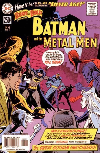 The army approaches Will Magnus. "Batman" needs help defending Gotham City from "Felix Faust" and "Catwoman". This is a hideous misunderstanding: Agamemno has switched the minds of villains and heroes, so that Penguin is in charge of Batman's body, while Oliver Queen and Dinah Lance are operating Felix Faust and Catwoman, respectively. The Metal Men are dupes, and help the villainous bird against his heroic foes. Escaping with a bit of Faust's magic and an improvised arrow, they disable the tank formed of the Metal Men, an act that knocks Will Magnus cold! "Catwoman" and "Felix Faust" return to the museum where they find a spell. When the robots return (having guessed the ploy), the spell turns them all human! Platinum thinks she might finally have a chance with Will Magnus as a human woman, but she's mistaken: he still sees the Metal Men as robots. To combat the "villains" they program the spell into Magnus' machinery and turn back into robots. They take up the chase again, but the "villains" manage to escape using another spell to turn an advertisement into the greatest trick arrow ever. And what odd transformation has struck the Penguin inside Batman's body? And will Platinum ever win Will Magnus' love? It seems not...