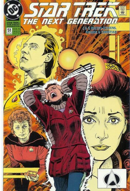 In a story set during Dr. Pulaski's tour of duty, Troi is possessed by ancient lifeforms that are draining all power from the Enterprise. Written by Judith and Garfield Reeves-Stevens, with art by Peter Krause and Michael Christian. Cover by Krause and Jerome Moore. New Format. Cover price $1.75.