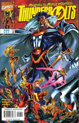 Baron Zemo and Fixer watch as the Thunderbolts battle a robotic Hulk, designed to absorb all kinds of energy. Just as the Thunderbolts realize this, the Lightning Rods (Great Lakes Avengers) appear and begin to attack the Hulk robot. Distracted by the newcomers, Moonstone turns her back on the Hulk robot which grabs her and begins to drain energy, which it then releases and uses to free Graviton from his micro-dimensional prison. But as the Thunderbolts and Lightning Rods fight this new threat, Citizen V appears to avenge his grandfather's honor for Zemo's use of that identity when forming the Thunderbotls.