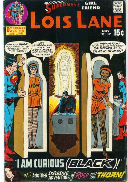 To get a story about life in Little Africa, a black ghetto in Metropolis, Lois Lane has Superman use a transformation machine designed by Dahr-Nel to turn her into a black woman. During her stay there, she meets neighborhood activist Dave Stevens, and helps save his life with a transfusion of her own blood after he is shot by drug dealers. When he awakens, and sees she has become a white woman again, he accepts her sacrifice nonetheless with gratitude.