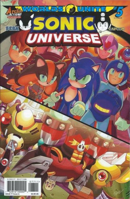 The next exciting chapter in the SONIC/MEGA MAN 'WORLDS UNITE' crossover event starts here! 'Worlds Unite' Part Five: The worlds of Sonic and Mega Man have been joined together by Sigma, and it's going to take a full-on army of unified heroes to make it right! Actually-scratch that-it's going to take some heroes AND some villains! When the mysterious and malicious Xander Payne inexplicably arrives with Drs. Eggman and Wily in tow, our heroes get new insight into Sigma's plans! Featuring cover art from the legendary Patrick 'SPAZ' Spaziante and variant cover art from CLAUS-Justin Harder (Thor: the Dark World, SNL) and part 5 of the epic 12-part connecting variant cover series by artist Ben Bates! Script: Ian Flynn Art: Edwin Huang, Gary Martin, John Workman and Gabriel Cassata Cover: Patrick 'SPAZ' Spaziante Super-group Variant Cover: CLAUS-Justin Harder Epic Poster Variant (pt5 of 12): Ben Bates