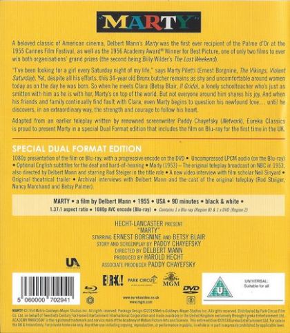 Marty, a butcher who lives in the Bronx with his mother is unmarried at 34. Good-natured but socially awkward he faces constant badgering from family and friends to get married but has reluctantly resigned himself to bachelorhood. Marty meets Clara, an unattractive school teacher, realising their emotional connection, he promises to call but family and friends try to convince him not to.