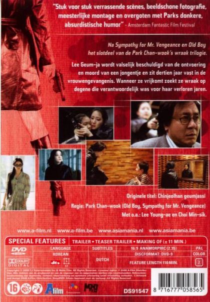 Na Sympathy for Mr. Vengeance en Old Boy het slotdeel van de Park Chan-wook's wraak trilogie.Lee Geum-ja wordt valselijk beschuldigd van de ontvoering en moord van een jongetje en zit dertien jaar vast in de vrouwengevangenis. Wanneer ze vrijkomt zoekt ze wraak op degene die verantwoordelijk was voor haar verloren jaren.
