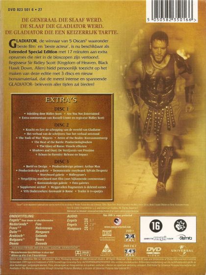 GLADIATOR, de winnaar van 5 Oscars® waaronder ‘beste film’ en ‘beste acteur’, is nu beschikbaar als Extended Special Edition met 17 minuten aan extra opnames die niet in de bioscopen zijn vertoond.Regisseur Sir Ridley Scott (Kingdom of Heaven, Black Hawk Down, Alien) hield persoonlijk toezicht op het maken van deze editie met 3 discs en nieuw bonusmateriaal, dat de meest intense en spannende GLADIATOR- belevenis aller tijden zal bieden!