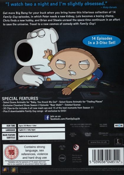 Get more Big Bang for your buck when you bring home this hilarious collection of 14 Family Guy episodes, in which Peter needs a new kidney, Lois becomes a boxing champ, Chris finds a new hobby, and Brian and Stewie unravel the space-time continuum in an effort to save the universe. Travel to a new cosmos of comedy with Family Guy!