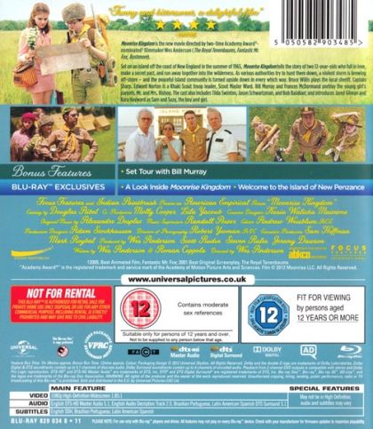 Moonrise Kingdom is the new movie directed by two-time Academy Award-nominated filmmaker Wes Anderson (The Royal Tenenbaums, Fantastic Mr. Fox, Rushmore). Set on an island off the coast of New England in the summer of 1965, Moonrise Kingdom tells the story of two twelve-year-olds who fall in love, make a secret pact, and run away together into the wilderness. As various authorities try to hunt them down, a violent storm is brewing off-shore -- and the peaceful island community is turned upside down in more ways than anyone can handle. Bruce Willis plays the local sheriff. Edward Norton is a Khaki Scout troop leader. Bill Murray and Frances McDormand portray the young girl's parents. The cast also includes Tilda Swinton, Jason Schwartzman, and Jared Gilman and Kara Hayward as the boy and girl.