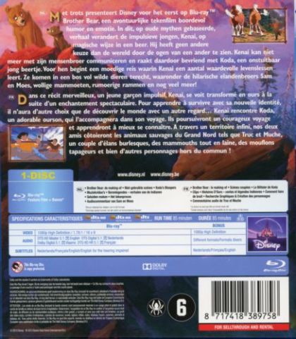 Met trots presenteert Disney voor het eerst op Blu-ray™ Brother Bear, een avontuurlijke tekenfilm boordevol humor en emotie. In dit, op oude mythen gebaseerde, verhaal verandert de impulsieve jongen, Kenai, op magische wijze in een beer. Hij heeft geen andere keuze dan de wereld door de ogen van een ander te zien. Kenai kan niet meer met zijn mensenbroer communiceren en raakt daardoor bevriend met Koda, een onstuitbaar jong beertje. Voor hen begint een moedige reis waarin Kenai een aantal waardevolle levenslessen leert. Ze komen in een bos vol wilde dieren terecht, waaronder de hilarische elandenbroers Sam en Moes, wollige mammoeten, rumoerige rammen en nog veel meer!