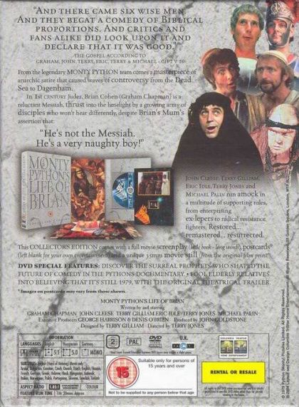 From the legendary Monty Python team comes a masterpiece of anarchic satire that caused waves of controversy from the Dead Sea to Dagenham.In 1st century Judea, Brian Cohen (Graham Chapman) is a reluctant Messiah, thrust into the limelight by a growing army of disciples who won't hear differently, despite Brian's Mum's assertion that: "He's not the Messiah. He's a very naughty boy!"John Cleese, Terry Gilliam, Eric Idle, Terry Jones and Michael Palin run amock in a multitude of supporting roles, from enterprising ex-lepers to radical resistance fighters. Restored... remastered... resurrected.This Collector's Edition comes with a full movie screenplay (little book - long words), postcards (left blank for your own entertainment) and a unique 35mm movie still (from the original film print!).