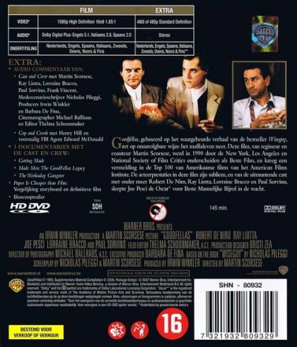 From Nicholas Pileggi's true-life bestseller Wiseguy, Goodfellas explores the criminal life like no other movie. Directed and co-written by Martin Scorsese, it was judges 1990's Best Picture by the New York, Los Angeles and National Societies of Film Critics and named to the American Film Institute's Top-100 American Filds List. Electrifying performances abound, and from a standout cast that includes Robert De Niro, Ray Liotta, Lorraine Bracco and Paul Sorvino, Joe Pesci walked off with the Best Supporting Actor Academy Award.